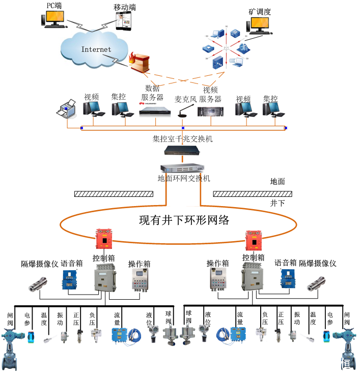 PLC控制系统配置的传感器:射流负压、出口压力、电机温度、电机振动、水仓液位、阀门到位、电机智能综保装置。下图是系统构架图。