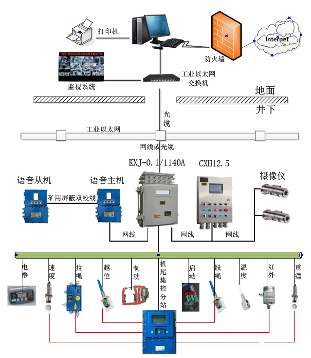 本控制系统主要由矿用PLC控制箱、甩道控制分站、保护传感器、预警通话系统、视频监控系统等组成。下图 是整个系统的硬件组成图