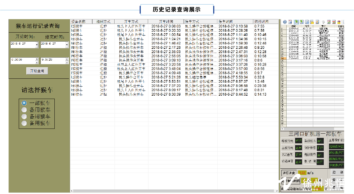 本系统可以自动分析、判断停车原因,并在上位机和现场操作箱显示屏上显示停车原因,停车原因主要包括:运行周期结束正常停车、保护动作停车、井下急停停车、远方急停停车、通讯故障停车、电机故障停车、制动闸故障停车。