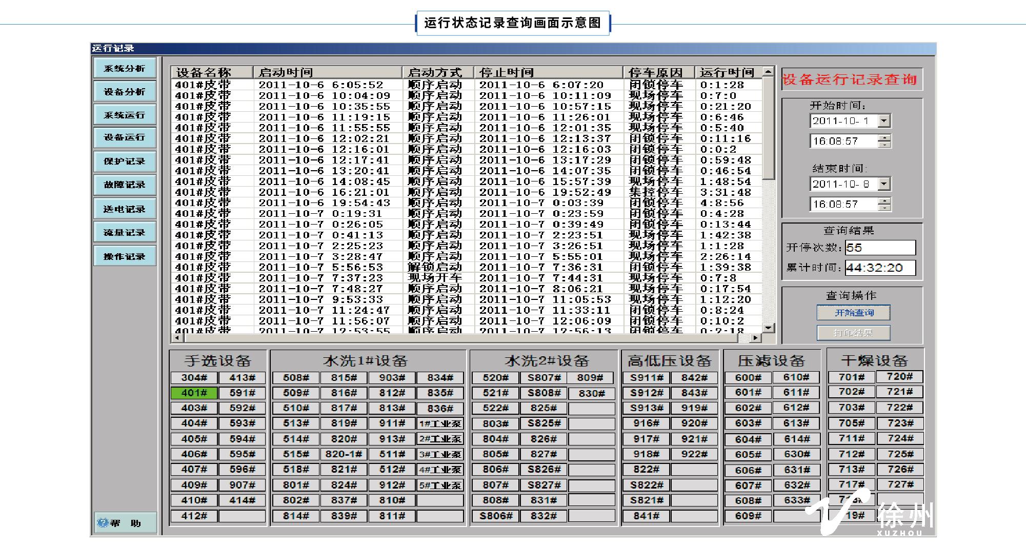 14)设备运行记录:实时记录设备的开停状况,能查询1年内的设备的开停情况,并自动累计运行时间,开停次数等。记录内容包括:设备名称、开车时间、开车方式、停车时间、停车原因、运行时间等。