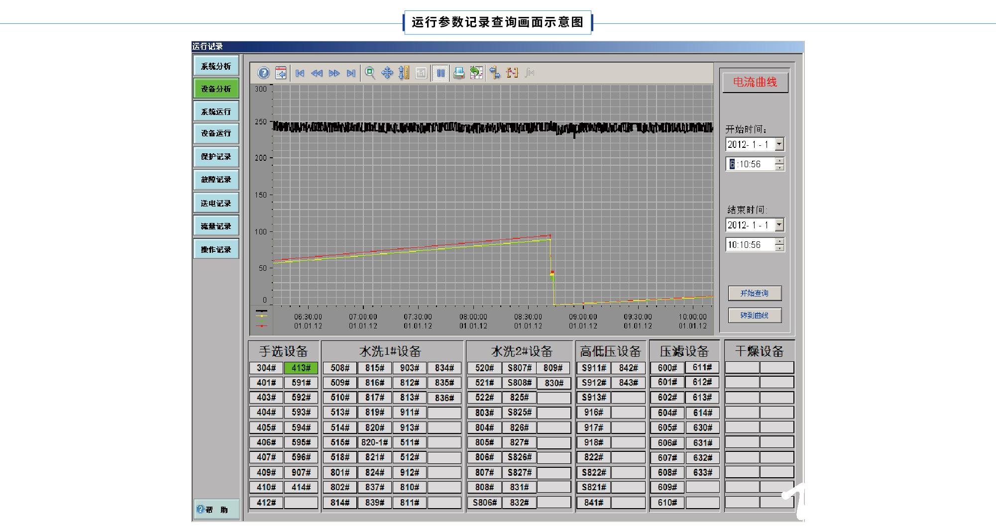 11)设备故障分析:当设备停车时,系统能自动判断停车原因。主要停车原因如下:电机保护故障停车、皮带保护故障停车、现场停车、闭锁停车、掉电停车、集控停车、自动停车、流程停车、系统急停等,其中,电机保护故障能具体到故障原因,皮带保护故障具体到故障的位置。