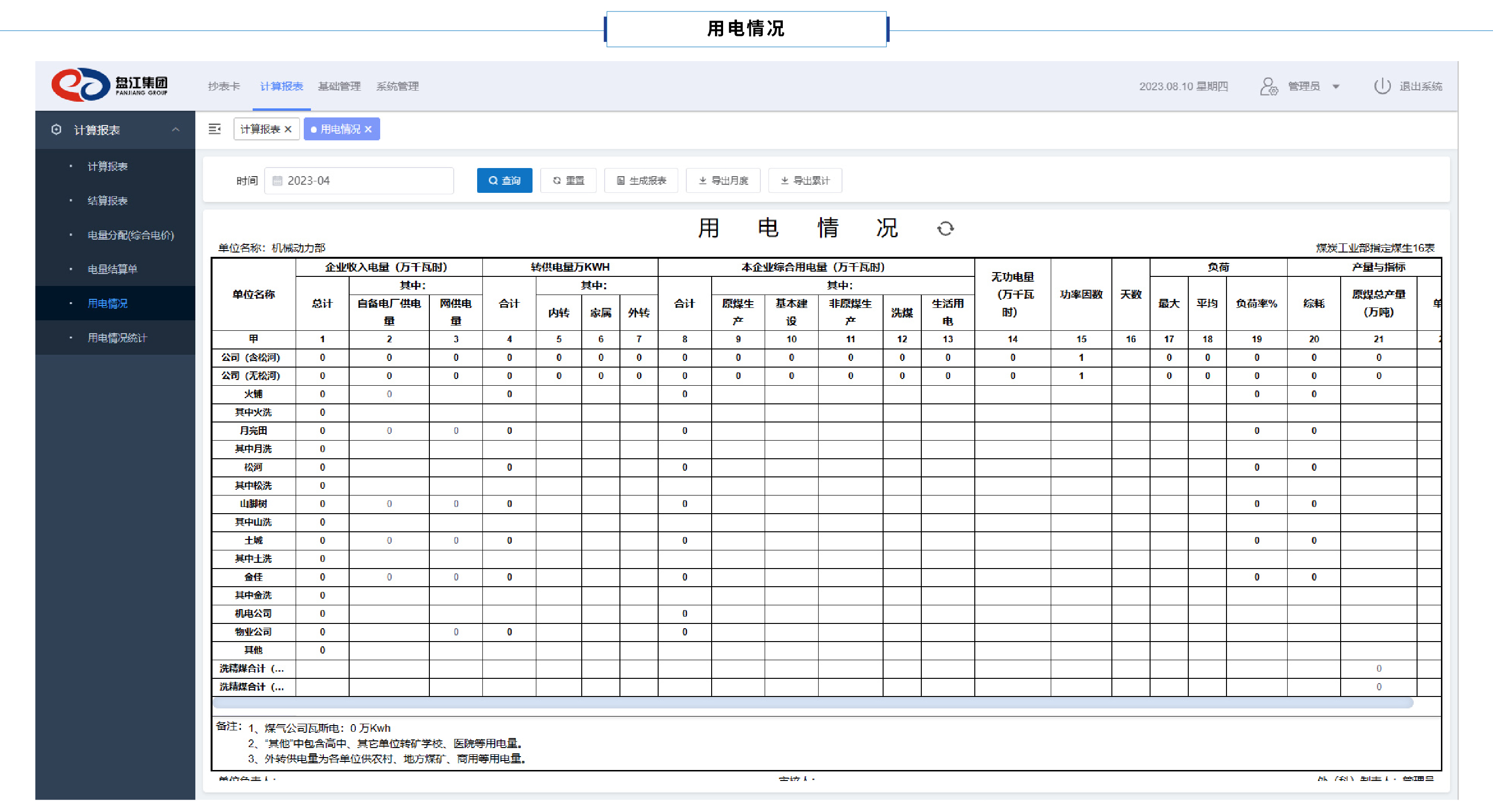 用电情况报表即煤炭工业部指定煤生16表,对各用电单位的企业收入电量、转供电量、企业综合用电量、无功电量、功率因数、天数、最大负荷、平均负荷、负荷率、综耗指标、原煤总产量、单耗等数据进行一键计算,生成指定时间段的数据报表。