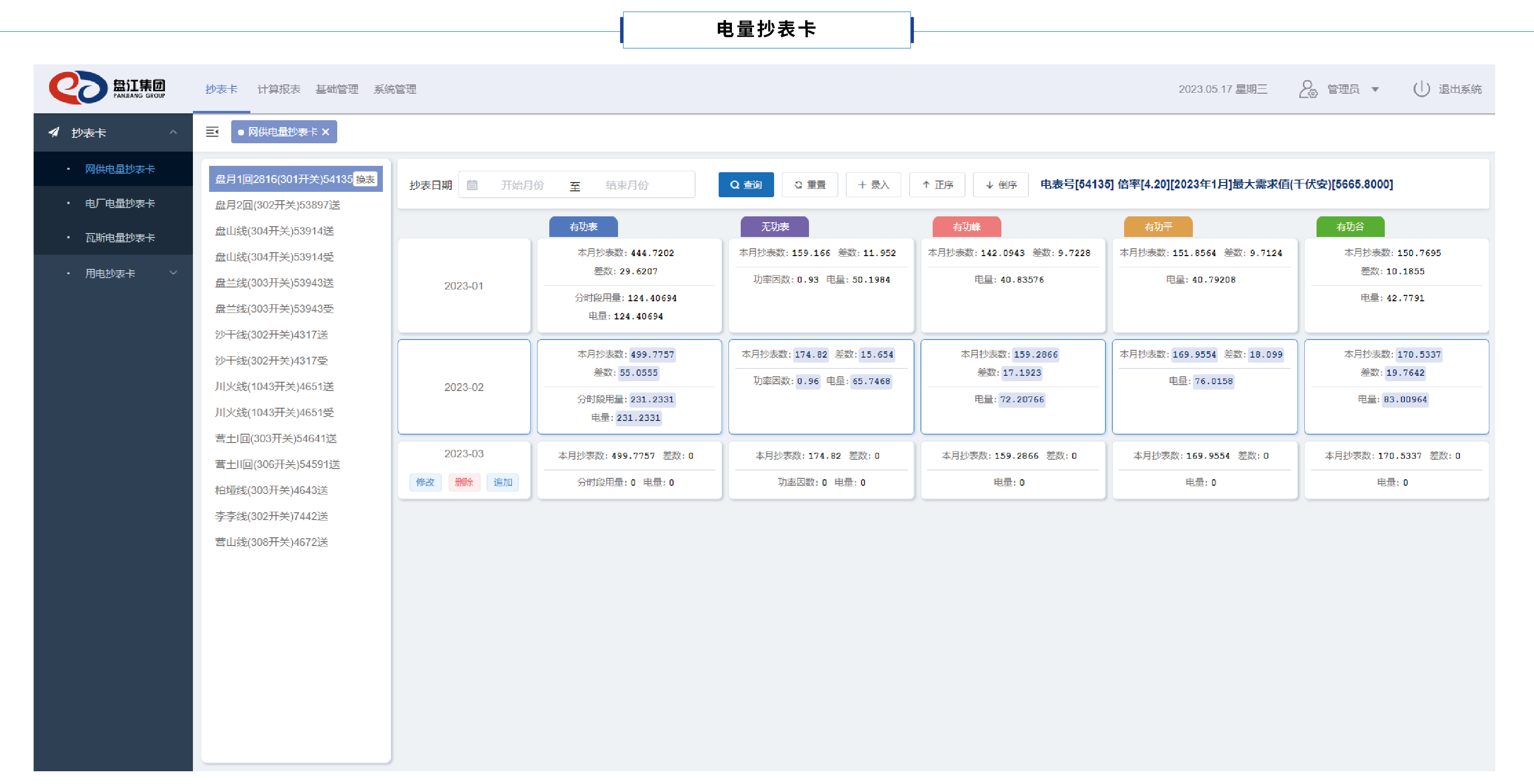 3、用电数据分析实现电费数据的环比、同比、累计值比对,自动发现数据异常情况,提供数据异常报警功能;包括但不限于:综合用电分类的原煤生产、基本建设、非原煤生产、洗煤、生活用电的电量计算和异常数据监控功能;功率因数计算及根据功率因素动态进行力率调整功能;根据原煤产量、综合用电量数据进行综合能耗、单耗数据的定额、累计数据计算和监控功能。